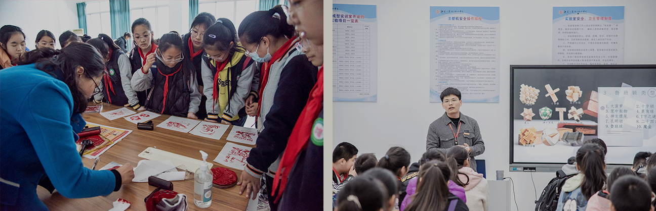 在大学生活动中心里陈列了许多由生活中创生出的非遗文化展品,,同学们通过观摩活字印刷、、拓印、、、鲁班锁、、、、锡火烫印、、、、3D打印等精美作品,,感受工业艺术的美与智慧。。。。