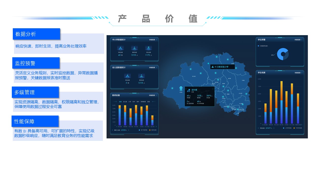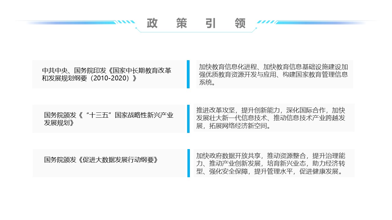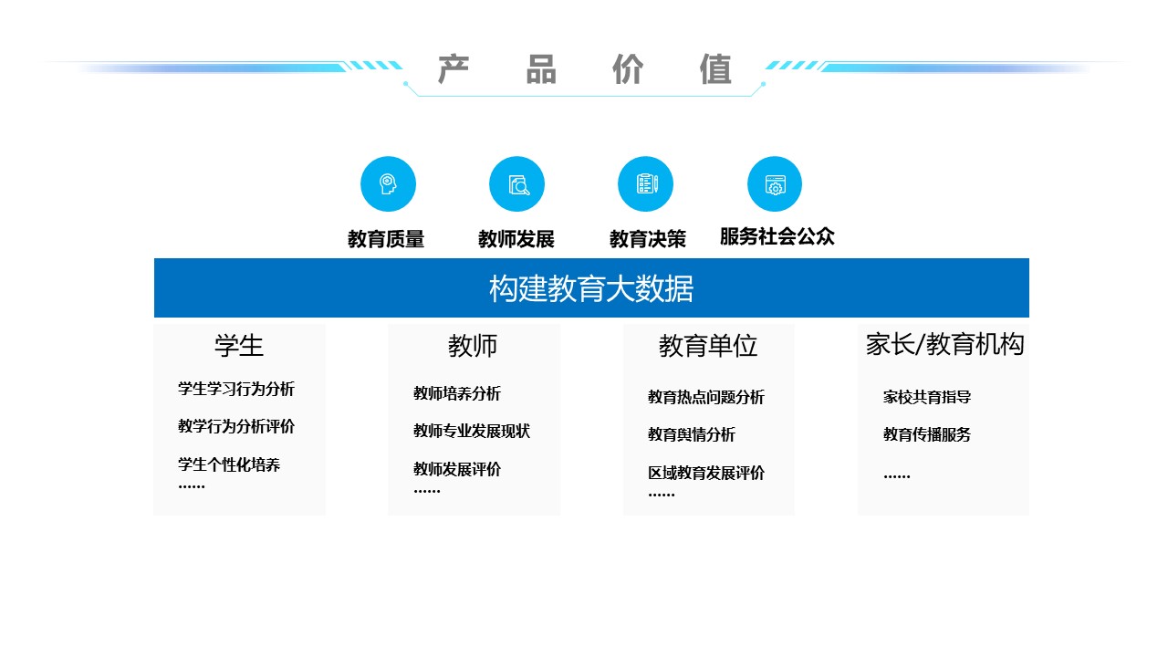 AG尊龙教育大数据解决方案以推进教育治理数字化转型为目标,,,构建面向教育管理决策和教学数据分析的大数据支撑体系。。。。旨在打通教育业务数据孤岛,,,,实现数据互通、、、、业务协同;支撑精准决策,,,挖掘教育数据服务于教育管理、、、教育教学、、、教育决策的价值。。