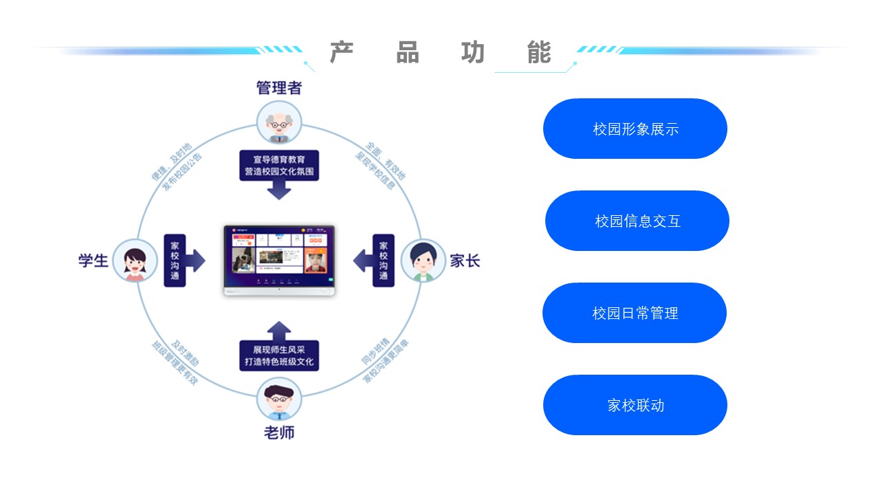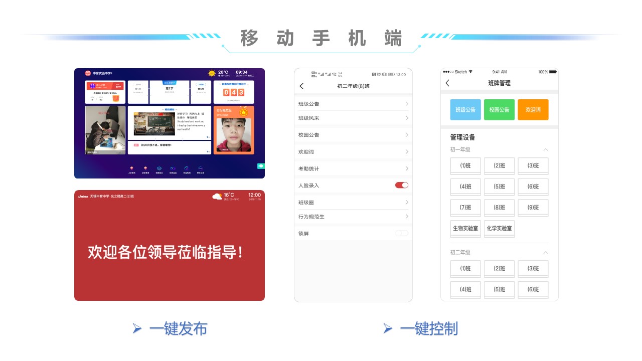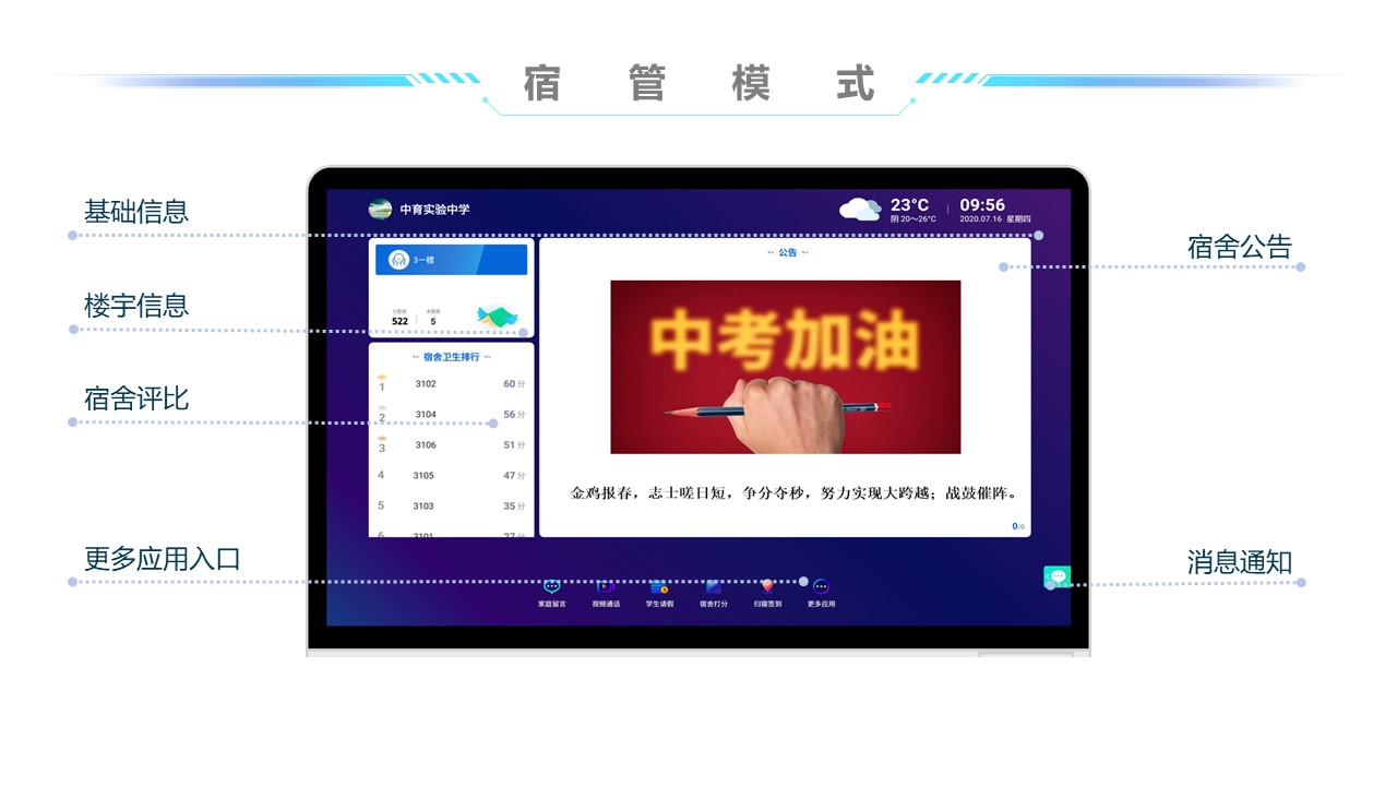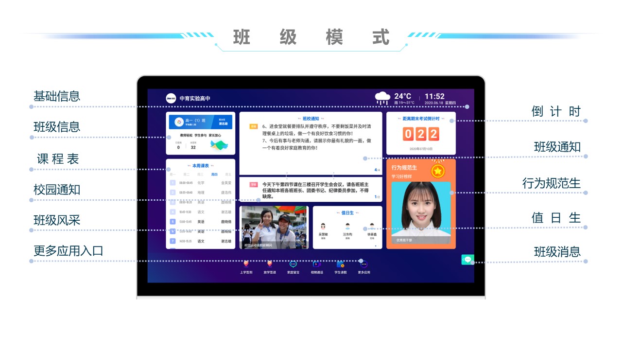 AG尊龙智慧班牌系统由电子班牌、、、教师APP、、、、家长APP、、、、后台大数据服务、、、、拓展智能硬件五部分组成,,,,集班级文化展示、、、、班级公告、、、、走班排课、、、、考勤管理、、、素质评价、、、、资源管理、、弹性离校、、、家校互联等应用于一体,,,对接智慧校园平台,,让校园管理一体化、、数据化。。