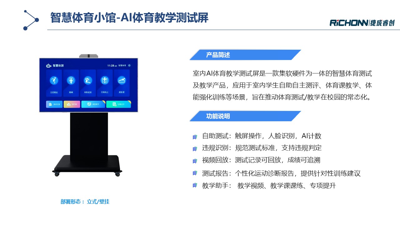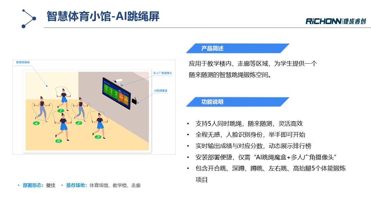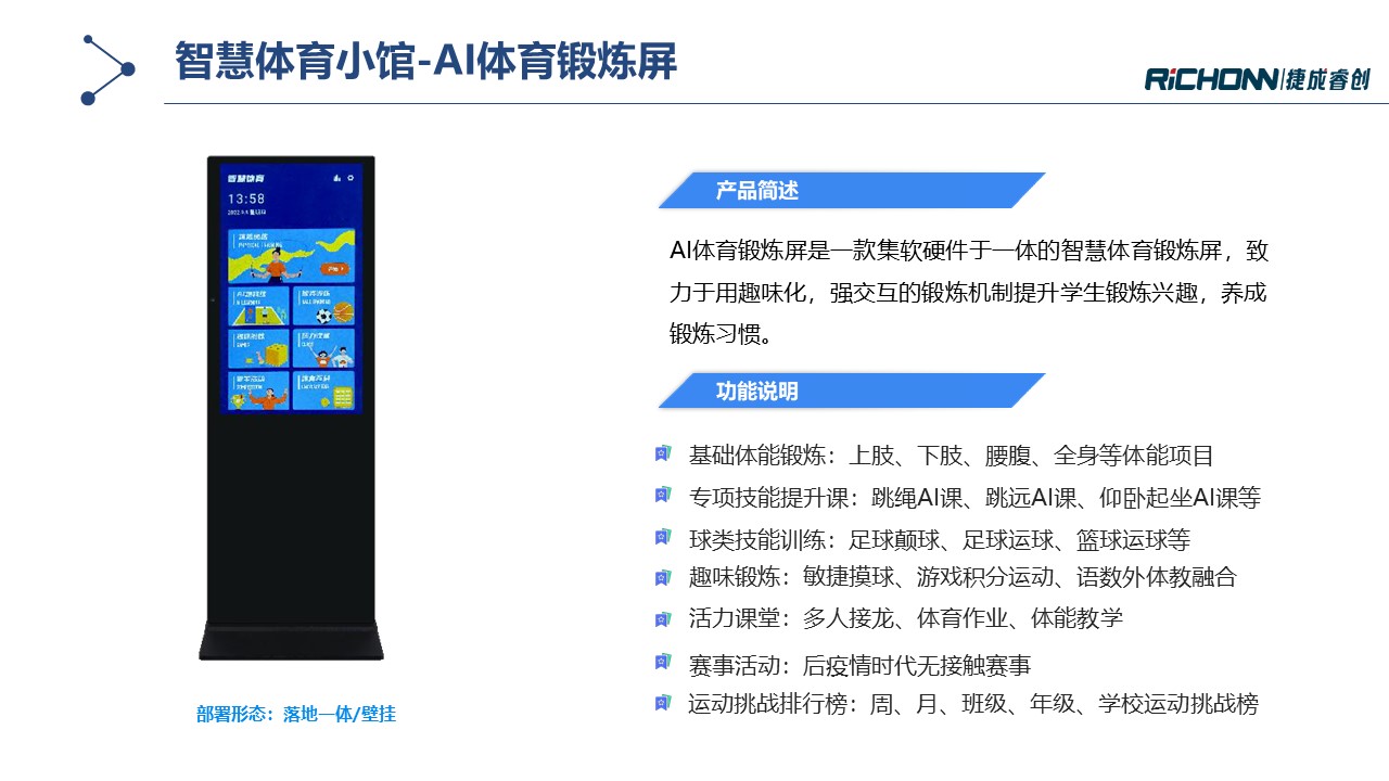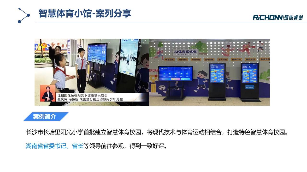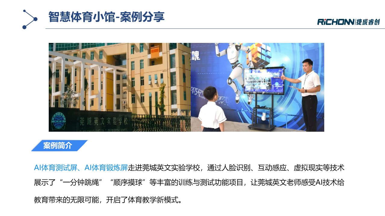 智慧体育小馆通过多种AI体育锻炼及测试设备构建体育实训室,,,,旨在提升校园运动氛围培养学生运动兴趣,,,围绕运动能力发展建立智能评测体系,,同时培育专业教师队伍,,,增强教学综合能力。。。。