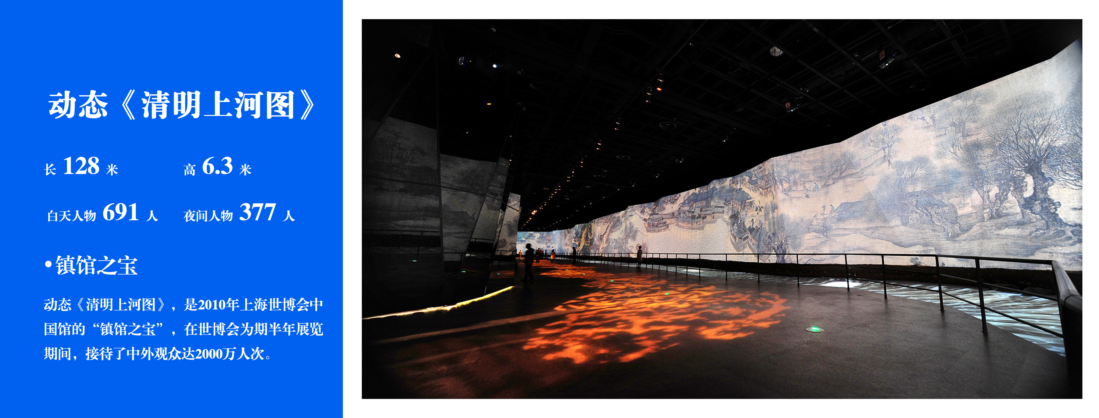 会动的《清明上河图》,,,,是2010年上海世博会中国馆的“镇馆之宝”,,,,这幅长128米高6.5米的巨幕,,,,是讲好中国故事、、、、弘扬中国文化的宏大载体,,,,是中华民族的传统文化与当代科技的完美结合。。。在世博会为期半年展览期间,,,接待了中外观众达2000万人次。。。