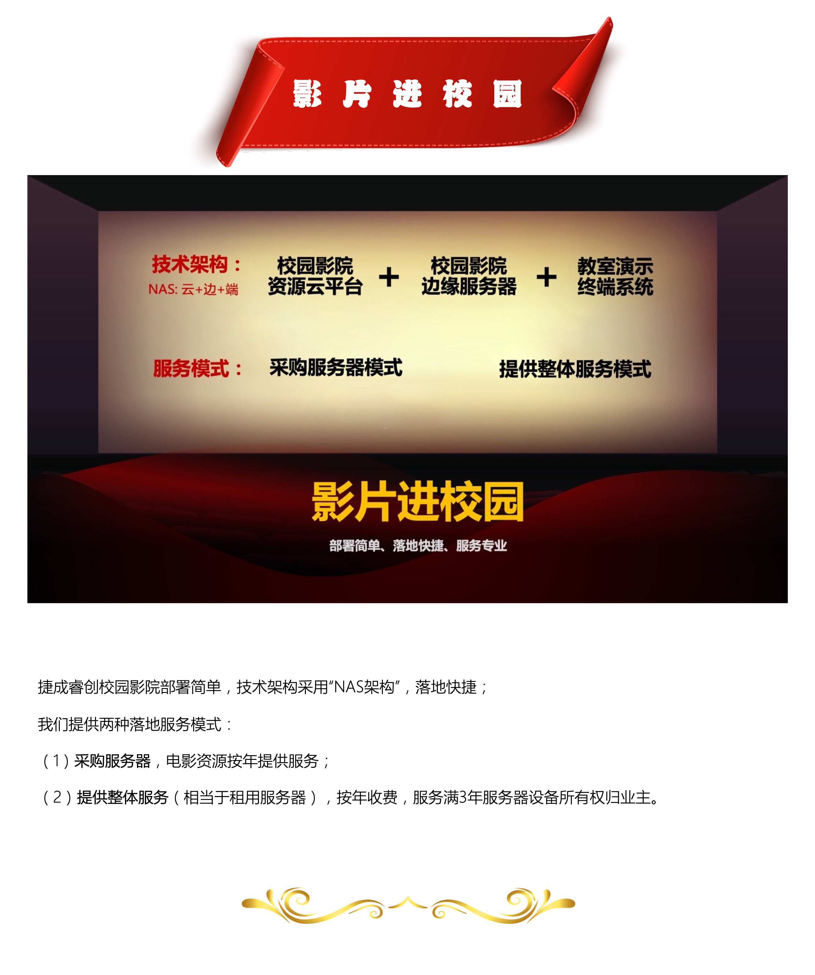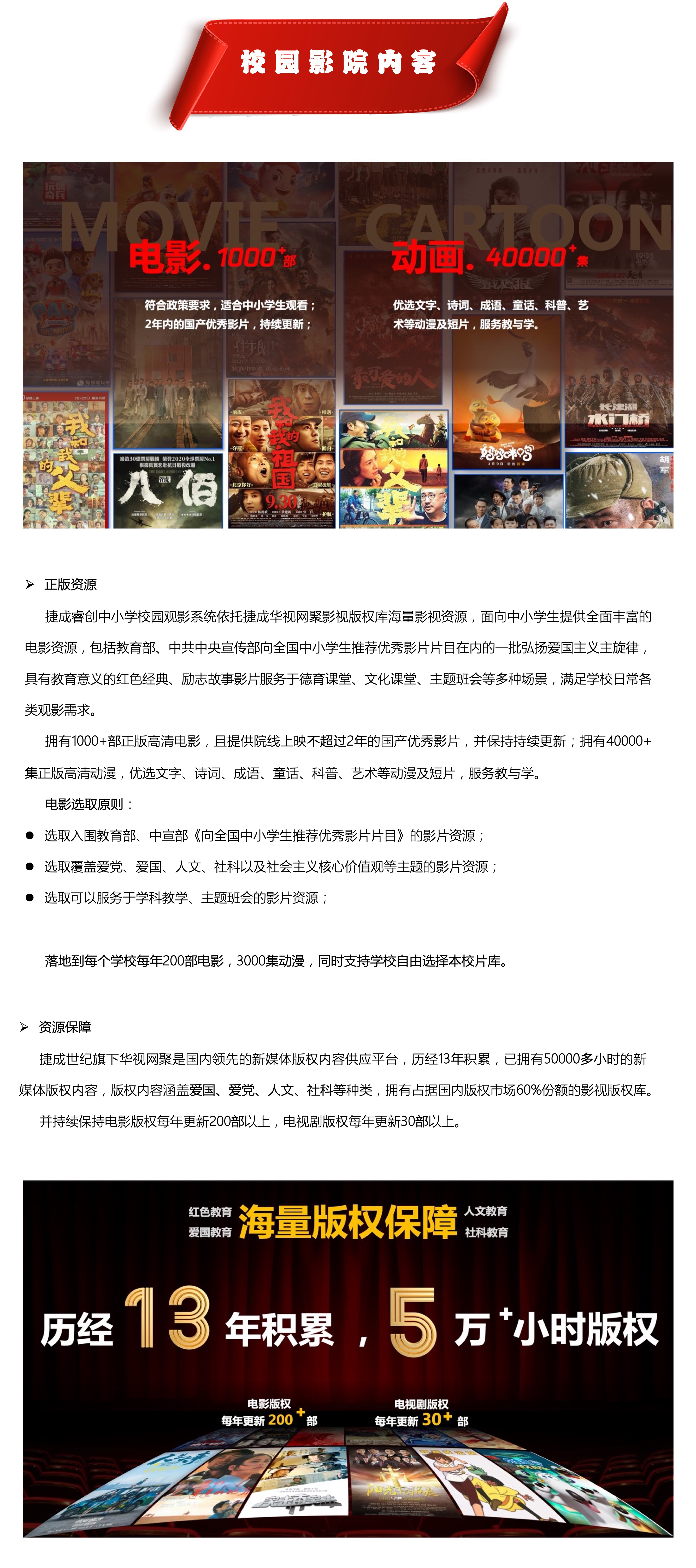 AG尊龙校园影院充分依托捷成华视网聚影视版权库海量影视资源,,,面向中小学生提供全面丰富的电影资源,,,包括教育部、、、、中共中央宣传部向全国中小学生推荐优秀影片片目在内的一批弘扬爱国主义主旋律的影片,,,服务全国2.6亿中小学生观影需要。。。。